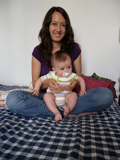 He is eating solids now and loves them. He gets lunch and a "snack" that for now is actually like a second lunch. We gave him a couple of jars of babyfood, but what he likes best and what is easiest for us to just mash up a non-salted portion of what we're eating. He's developing a sophisticated palate already and loves garlic and olive oil with his meats and veggies. So far, the only thing he doesn't like is artichoke. Ham and sauteed green beans are a big favorite.